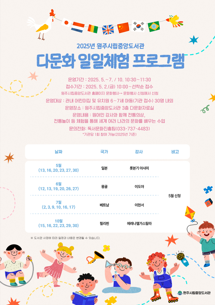 [스포츠서울ㅣ원주=김기원기자]원주시립중앙도서관은 다문화에 대한 이해도를 높이고 소통을 강화하기 위해 ‘2025년 다문화 일일체험 프로그램’을 운영한다.