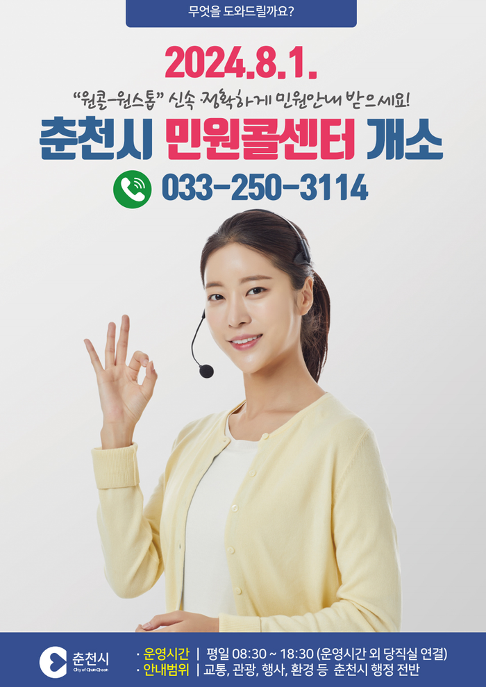 춘천시 민원콜센터는 센터장을 포함해 9명의 상담 인력이 근무 중이며, 평일 오전 8시 30분부터 오후 6시 30분까지 운영된다.