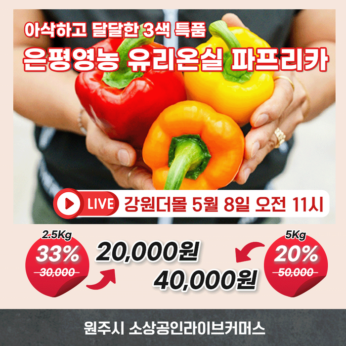 오는 8일(목) 오전 11시 강원더몰(gwdmall.kr) 라이브커머스 채널을 통해 첫 방송이 열린다. 은평영농 유리온실의 친환경 파프리카를 소개할 예정이다.