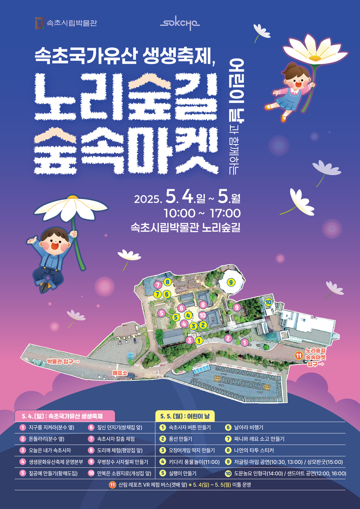 4일부터 5일까지는 ‘속초 국가유산 생생축제’와 어린이날 맞이 창의 체험, 공연이 연달아 이어지며, 이틀간 노리숲길 숲속마켓도 함께 개최되어 방문객에게 다채로운 체험과 공연을 선사한다.
