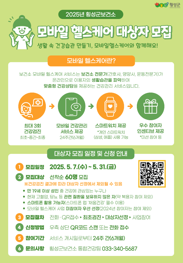 [스포츠서울ㅣ김기원기자]횡성군보건소는 스마트폰 앱과 디지털 기기를 활용해 일상 속 건강 실천을 돕는2025년 모바일 헬스케어 사업 대상자 60명을 7일부터 선착순 모집한다.