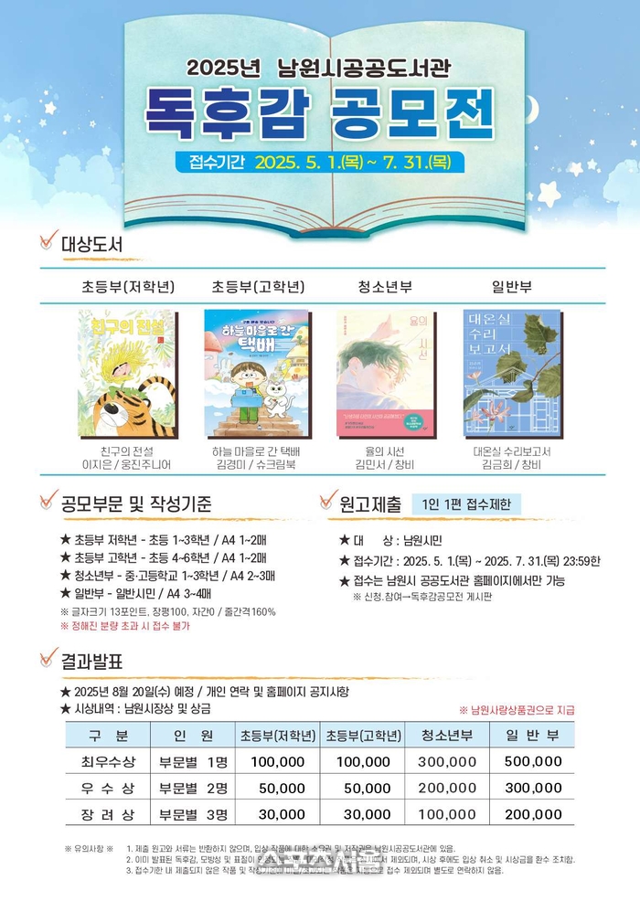 대상도서는 남원시민들이 직접 선정한 ‘2025년 올해의 책’으로, 초등부-저학년 ‘친구의 전설’(이지은, 웅진주니어), 초등부-고학년 ‘하늘마을로 간 택배’(김경미, 슈크림북), 청소년부 ‘율의 시선’(김민서, 창비), 일반부 ‘대온실 수리 보고서’(김금희, 창비)이다.