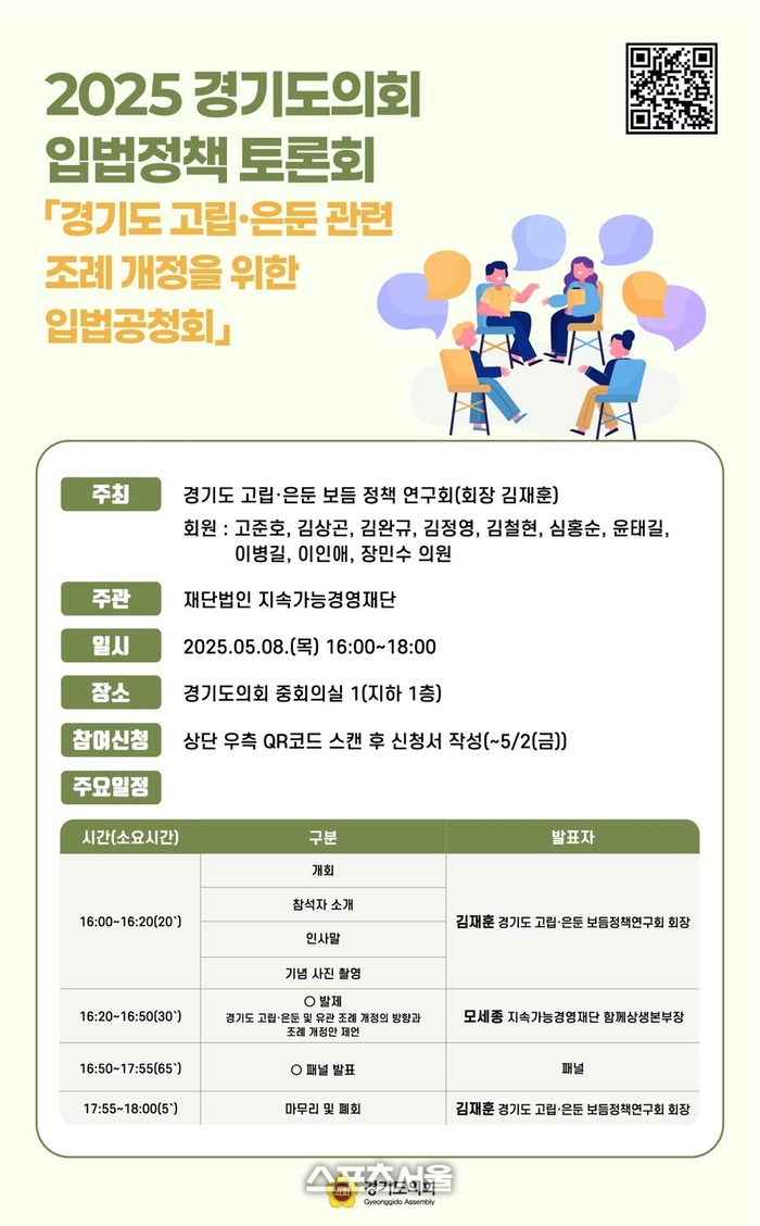 이날 공청회는 모세종 지속가능경영재단 센터장이 발제를 맡고 유현주 사회적협동조합 내비두 이사장, 박형규 경기대교수가 토론자로 참여해 도의원 및 도 관계 공무원과 함께 실질적인 정책 개선 방안에 대한 의견을 나눈다. 공청회는 고립·은둔 관련 정책에 관심 있는 누구나 참석할 수 있다.