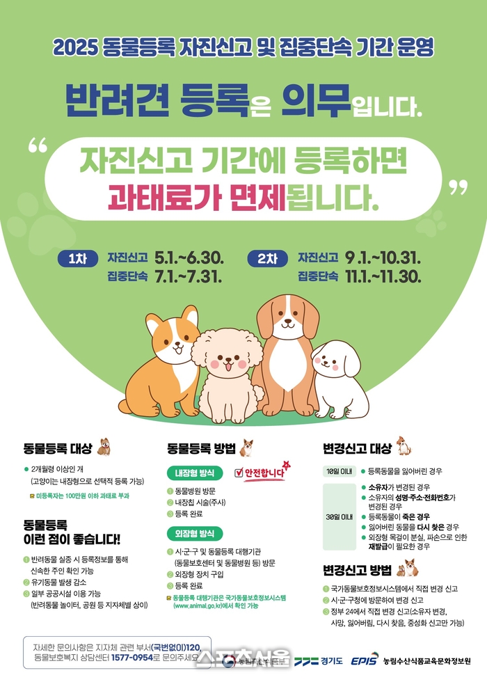 대상은 반려 목적으로 기르는 2개월령 이상 개로 반려 목적 고양이도 등록할 수 있다. 1차 자진신고 기간은 6월 30일까지, 2차 신고 기간은 9월 1일부터 10월 31일까지다. 7월과 11월에 집중단속이 진행된다. 자진신고 기간에 등록하면 과태료가 면제된다.