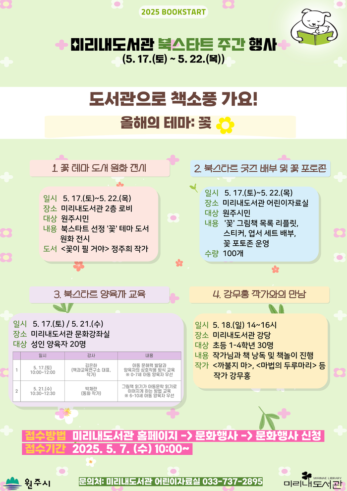 ‘꽃’을 테마로 진행되는 이번 북스타트 주간에는 《꽃이 필 거야》그림책 원화 전시, 《까불지 마》의 강무홍 작가와 함께하는 강연, 그림책을 통해 자녀 양육에 대해 배울 수 있는 북스타트 양육자 교육, 북스타트 굿즈 배부 등이 진행된다.