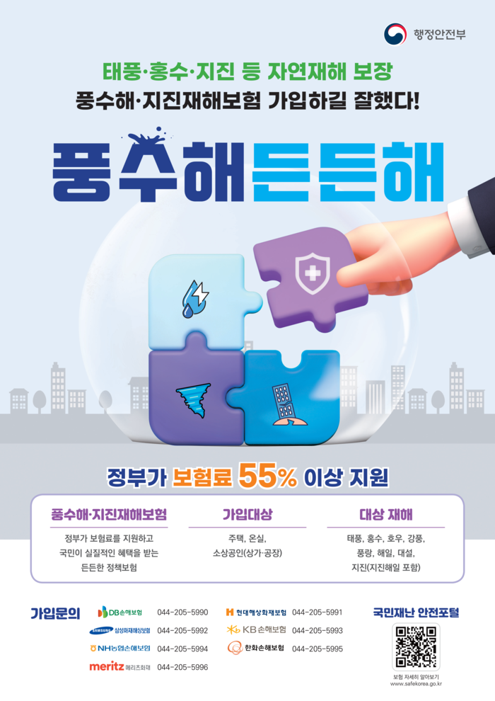 풍수해보험은 행정안전부가 관장하고 7개 민간 보험사가 운영하는 정책보험으로 태풍, 호우, 강풍, 해일, 대설, 지진 등 자연재해로 인한 다양한 피해를 보장하며, 주택(동산 포함), 온실(비닐하우스 포함), 소상공인의 상가·공장 등이 보험 대상이다.
