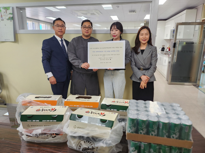 [스포츠서울ㅣ김기원기자]속초청해학교(교장 백행학)은 5월 2일(금) 쿠킹스튜디오 ‘플래버링’ 대표 김은정(푸드스타일리스트)와 본스치킨 교동점 대표 김민철, 22사단 사령부 상사 박승만이 각각 머핀과 쿠키 메달 200개와 치킨 100마리를 특수교육대상학생들에게 전달했다고 밝혔다.