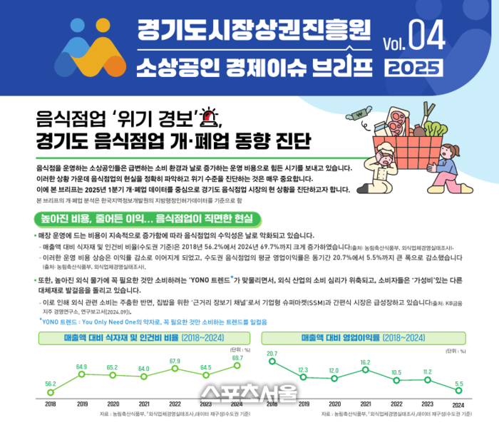 〔스포츠서울│수원=좌승훈기자〕경기도시장상권진흥원은 도내 음식점업의 최근 시장 변화와 구조적 위기를 다룬 ‘소상공인 경제이슈 브리프 VOL.04’를 발간했다고 7일 밝혔다.