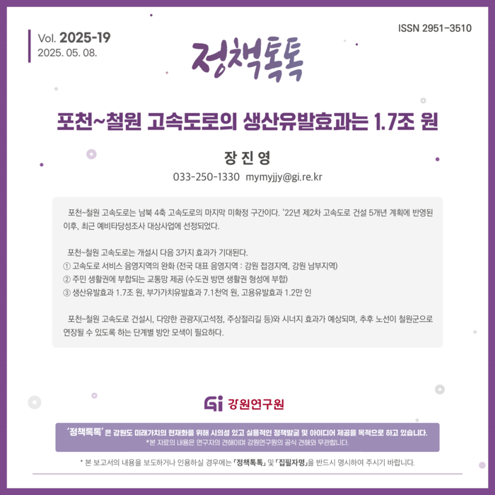 정책톡톡 제2025-19호(포천~철원 고속도로의 생산유발효과는 1.7조원) 발간