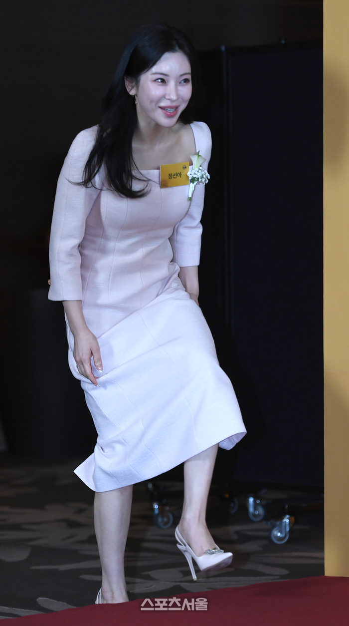 정선아가 8일 서울 여의도 콘래드호텔에서 열린 2025 브랜드 고객충성도 대상 시상식에서 뮤지컬배우(여) 부문상을 받은 후 포즈를 취하고 있다.