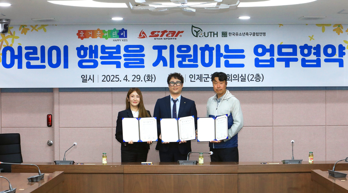 한편, 즐거운 어린이는 인제군 지역발전 및 관내 청소년 지원 활성화를 위해 최근 신신상사(주)스타스포츠, 사단법인 한국유소년축구클럽 연맹과 최근 인제군청 소회의실에서 업무협약을 체결했다.