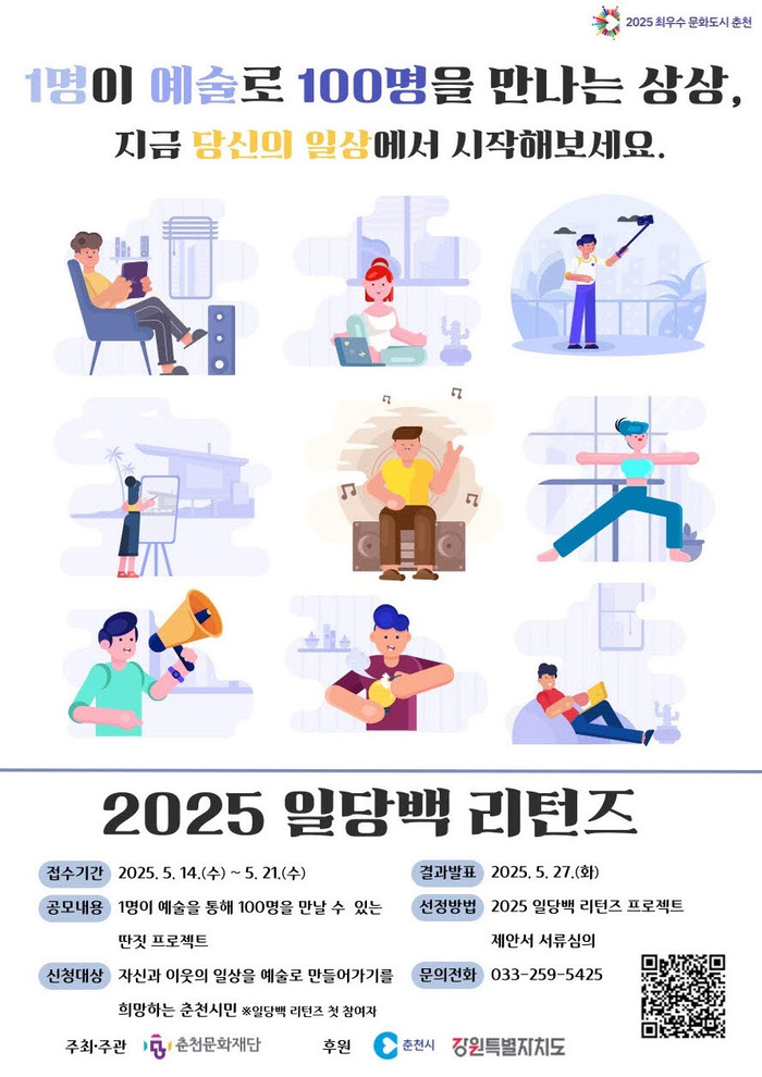 [스포츠서울ㅣ춘천=김기원기자]춘천문화재단(이사장 박종훈)은 시민 문화·예술기획 프로젝트 『2025 일당백 리턴즈 : 딴짓도 예술이다』의 참여자 10명을 5월 21일(수)까지 모집한다.