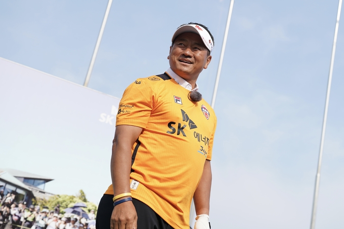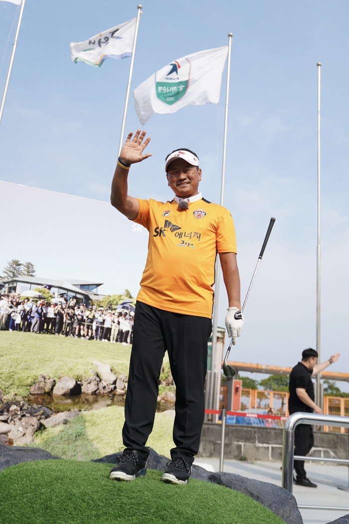 최경주는 이날 킥오프를 앞두고 제주월드컵경기장 관중석 E석 상단 국기 게양대 앞에서 제주의 오렌지색 홈유니폼을 입고 나타났다. 팬에게 손을 들고 인사한 그는 제자리에서 곧바로 시타에 나섰다. 그라운드 센터서클로 공을 집어넣는 게 목표였다. 최경주는 골프계 ‘대부’답게 클럽을 가볍게 휘둘렀다. 공은 센터서클 중앙 근처에 떨어졌다. 저절로 박수가 나왔다.