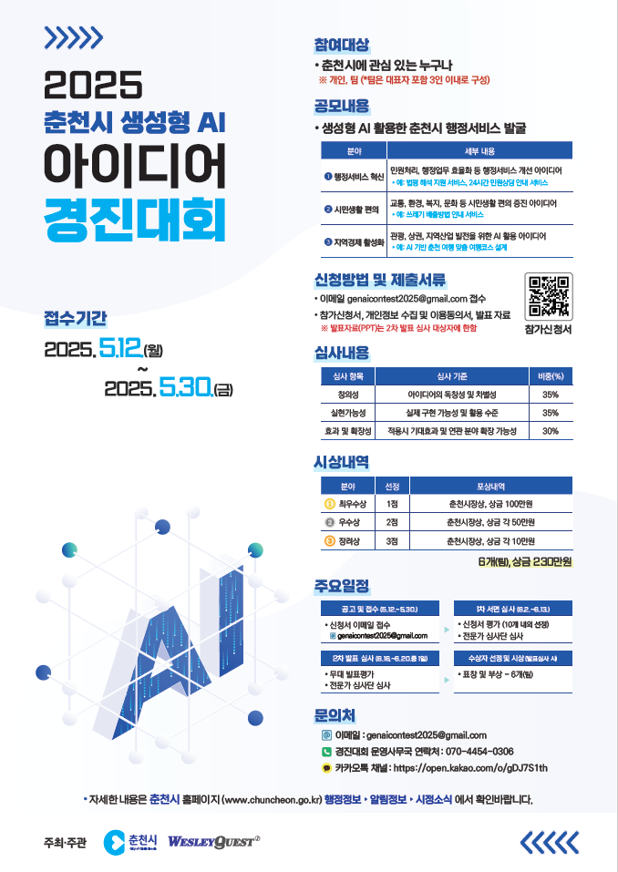 ‘2025 춘천시 생성형 AI 아이디어 경진대회’ 는 생성형 AI를 활용한 춘천시 행정서비스 혁신 아이디어 발굴로 오는 30일까지 열린다. 춘천시에 관심있는 누구나 참여가 가능하며 개인 또는 팀(3인 이내)으로 참가할 수 있다. 6개 팀을 선발해 총 230만원의 상금이 수여된다.