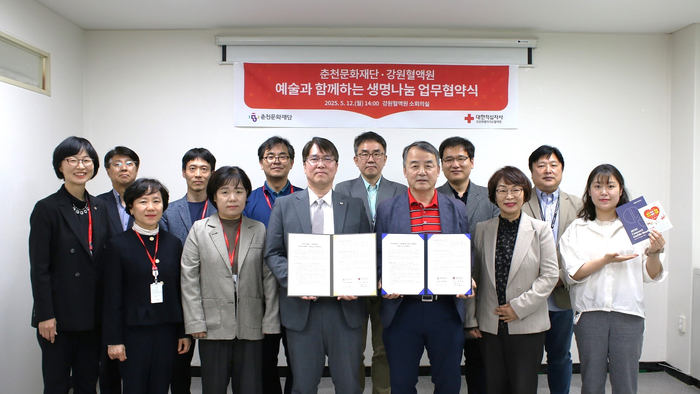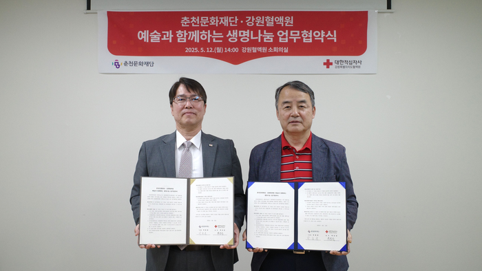 [스포츠서울ㅣ춘천=김기원기자]춘천문화재단(이사장 박종훈)과 대한적십자 강원특별자치도혈액원(원장 박진성)은 5월 12일(월) 강원혈액원 소회의실에서 ‘예술과 함께하는 생명나눔 업무협약’을 체결했다.