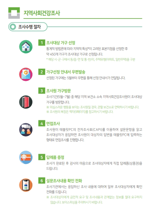 조사는 조사원이 직접 방문하는 1:1 면접 방식으로, 건강행태, 만성질환, 의료이용 등 총 19개 영역, 169개 문항을 다룬다. 조사원은 조사원증과 전용조끼를 착용하고 방문한다.