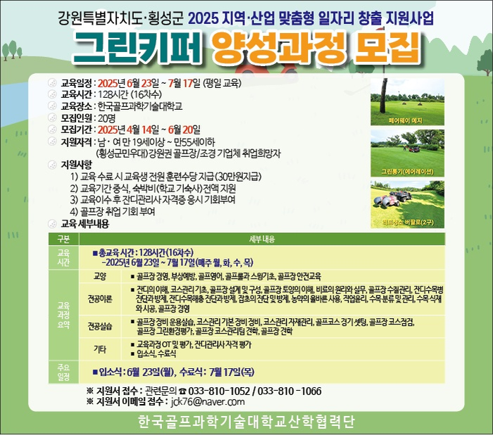 한편, 교육생 모집기간은 오는 6월 20일까지이며 관련 문의는 한국골프과학기술대학교(033-810-1052/1066)로 하면 된다.