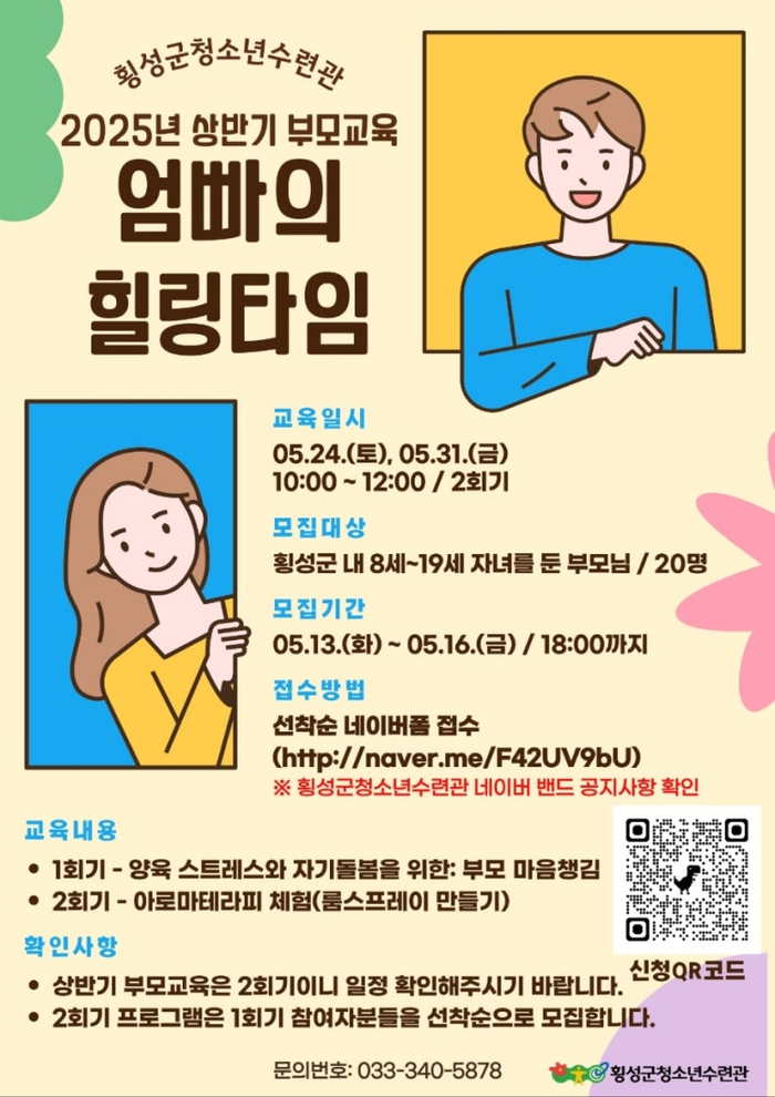 [스포츠서울ㅣ김기원기자]횡성군청소년수련관(관장 김홍석)이 5월 13일부터 16일까지 상반기 부모교육 프로그램 ‘엄빠의 힐링타임’에 참여할 학부모를 모집한다.