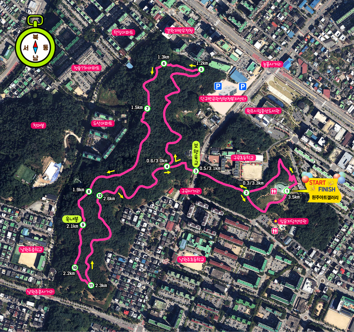 걷기축제가 열리는 ‘단구공원둘레길’은 남녀노소 누구나 걷기 편하게 정비된 데다 흙이 부드럽고 찰져 맨발걷기에 안성맞춤인 코스이다. 원주아트갤러리 앞 잔디광장에서 출발해 1시간 30분 동안 맨발로 걸으며 단구공원의 싱그러운 숲길과 도심의 풍경이 한눈에 담기는 아름다운 풍광을 즐길 수 있다.