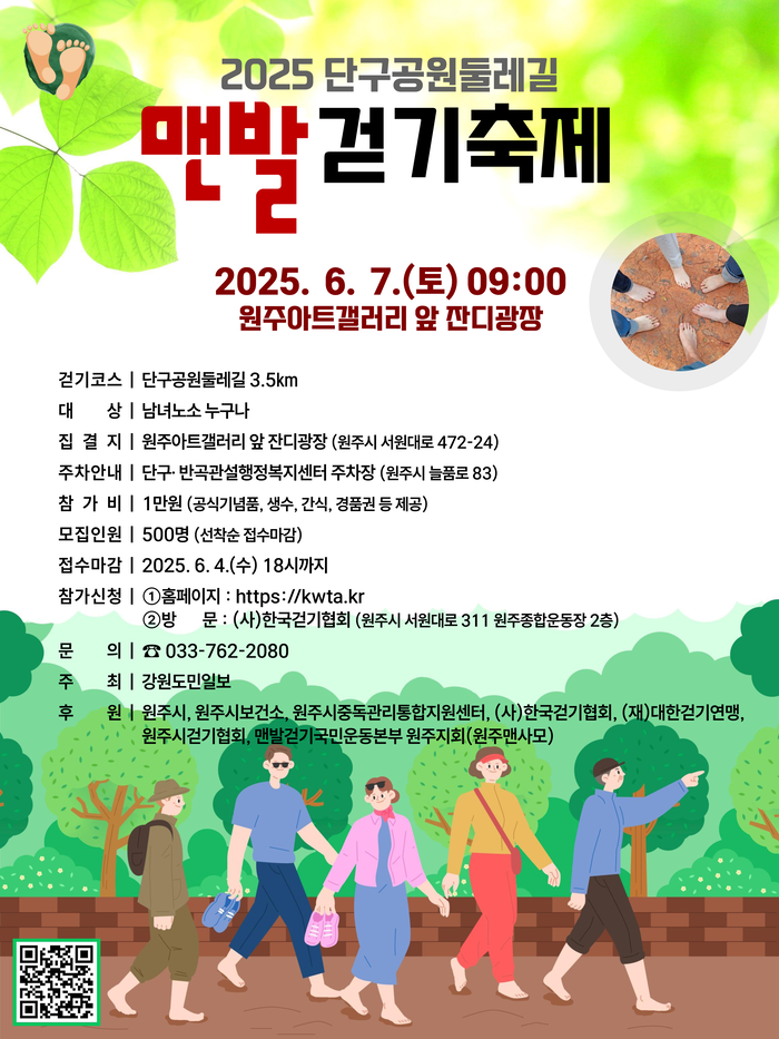 선착순 500명을 모집하며, 홈페이지(kwta.kr) 또는 방문(원주종합운동장 2층 걷기안내센터)을 통해 접수할 수 있다.