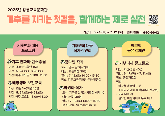 [스포츠서울ㅣ김기원기자]강원특별자치도교육청강릉교육문화관(관장 김웅기)는 5월 24일(토)부터 7월 12일(토)까지 초등학생에서 성인까지 전 세대를 대상으로 하는 환경 교육 프로그램 ‘2025년 기후를 지키는 첫걸음, 함께하는 제로 실천’을 운영한다.