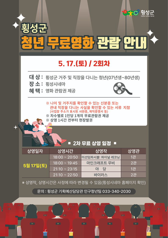 [스포츠서울ㅣ김기원기자]횡성군이 지역 청년들의 문화 향유를 위해 지난 3월 22일 1회차에 이어 오는 17일 2차 ‘횡성군 청년 무료영화 관람 지원사업’을 운영한다고 말했다.