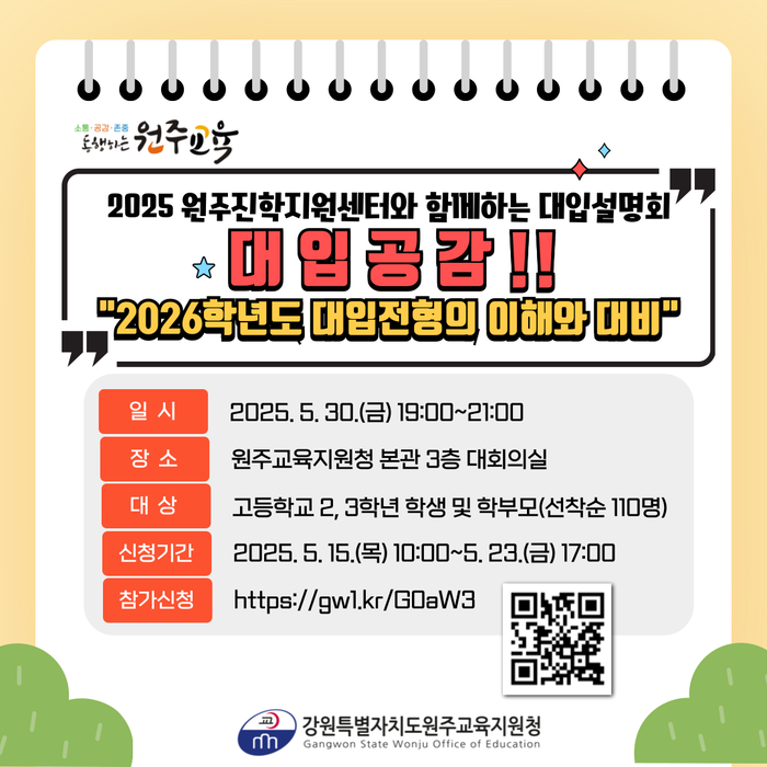 [스포츠서울ㅣ원주=김기원기자]강원특별자치도원주교육지원청(교육장 김성진)은 5월 30일(금) 19시 원주교육지원청 3층 대회의실에서 ‘2025 원주진학지원센터와 함께하는 대입 설명회 <대입공감!>’을 개최한다.