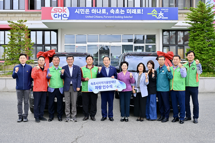 [스포츠서울ㅣ김기원기자]속초시는 15일 시청 광장에서 재난 및 안전사고 예방을 위한 예찰 활동 강화를 목적으로 신규 예찰차량 2대를 속초시지역자율방재단에 전달했다.