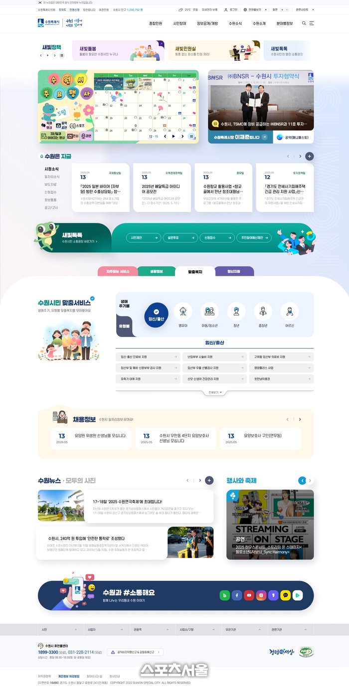 또 시민이 필요한 서비스를 쉽게 찾을 수 있도록 ‘수원시민 맞춤 서비스’ 영역을 홈페이지 중단에 신설했다. 생애주기에 따른 다양한 복지 혜택과 지원 정보, 생활 밀착형 정보를 분야별로 찾아볼 수 있다. 청년 지원 전용 메뉴에서는 청년층의 실질적인 고민과 수요를 반영한 정보를 알아볼 수 있다.