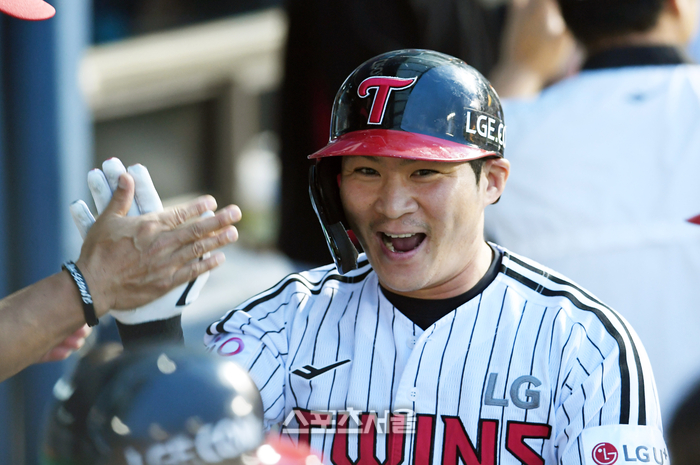 LG 오지환이 15일 잠실구장에서 열린 2025 KBO리그 키움과의 경기 4회말 2사 1루 상황에서 키움 선발 하영민을 상대로 2점 홈런을 친 뒤 코칭스태프와 하이파이브를 하고 있다 오지환의 시즌 5호 홈런. 2025. 5. 15.