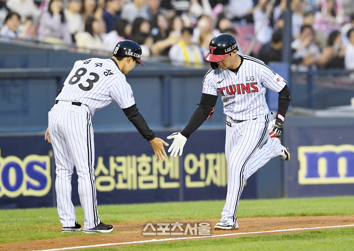 LG 오지환이 15일 잠실구장에서 열린 2025 KBO리그 키움과의 경기 4회말 2사 1루 상황에서 키움 선발 하영민을 상대로 2점 홈런을 친 뒤 정수성 코치와 하이파이브를 하고 있다 오지환의 시즌 5호 홈런. 2025. 5. 15.