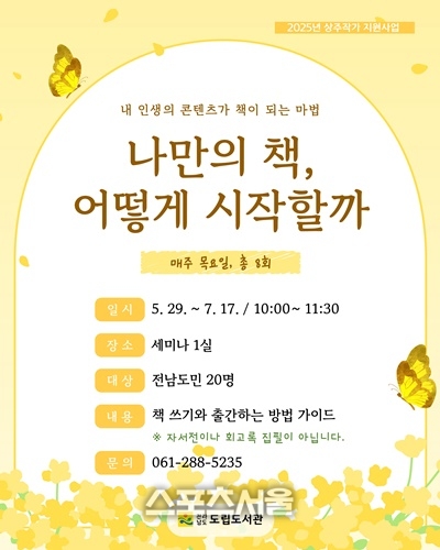 [스포츠서울|조광태기자] 전남도립도서관은 문화체육관광부가 주최하고 한국문화예술위원회가 주관한 ‘2025년 문학상주작가 지원사업’에 선정돼 오는 27일부터 ‘나에게 건네는 다정한 말, 낭독과 필사’를 시작으로 프로그램을 운영한다고 밝혔다.