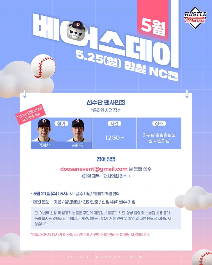 [스포츠서울 | 김동영 기자] 두산이 25일 잠실구장에서 열리는 NC와 정규시즌 맞대결에서 ‘5월 베어스데이’ 행사를 진행한다.