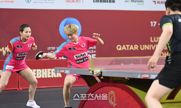 오준성, 김나영이 18일 카타르 도하 카타르대학교 스포츠 콤플렉스에서 열린 2025 국제탁구연맹(ITTF) 세계선수권대회 혼성복식 64강 뉴질랜드 딘 슈, 조슬린 램 조와 경기를 펼치고 있다. 2025. 5. 18. 도하(카타르) | 최승섭기자 thunder@sportsseoul.com