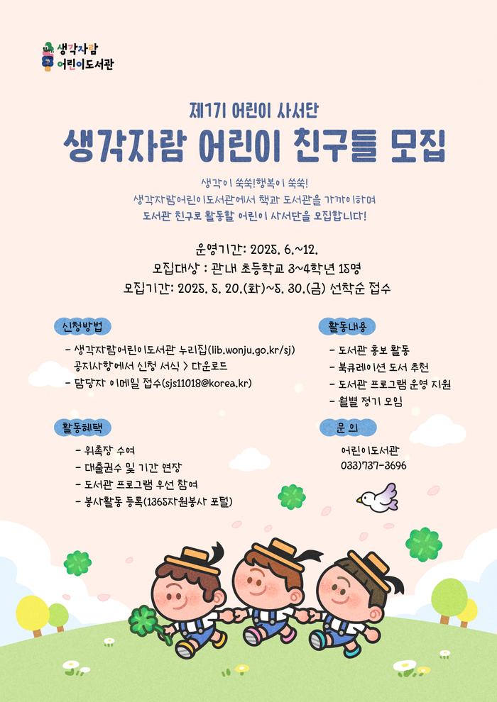자세한 사항은 생각자람어린이도서관(☎033-737-3696)으로 문의하면 된다.