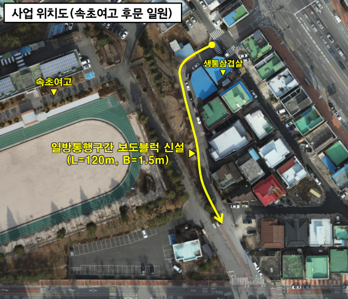새롭게 지정한 일방통행 구간은 속초여고 후문에서 정문까지 약 100m 구간이다. 시에서는 일방통행 지정으로 확보된 도로 공간을 활용하여 1.5m 폭의 보도를 신설해 학생을 비롯한 보행자들의 통행 안전을 강화할 계획이다.