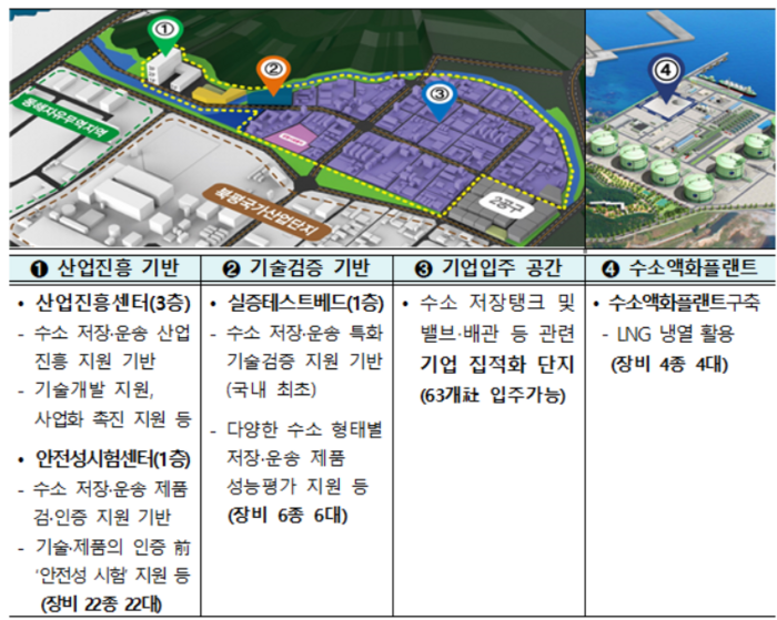 수소 저장・운송 클러스터는 2028년까지 총 3,177억 원을 투입하여 동해시에 △산업진흥센터, 안전성시험센터, 실증테스트베드 등 건축물 3개 동 △연구장비 41종, △기업입주공간을 마련하고, 삼척시에는 수소액화플랜트를 구축하는 사업이다.