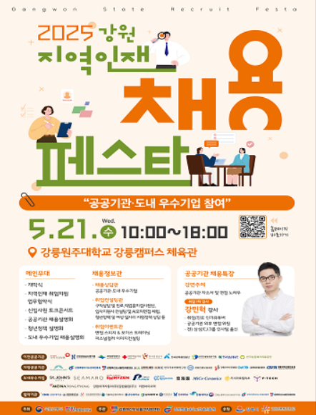 [스포츠서울ㅣ춘천=김기원기자]강원특별자치도(도지사 김진태)와 국토교통부는 도내 청년 인재들의 취업 기회 확대와 지역 내 일자리 매칭 강화를 위해, 5월 21일(수) 강릉원주대학교 강릉캠퍼스 체육관에서 『2025 강원 지역인재 채용페스타』를 개최한다고 밝혔다.