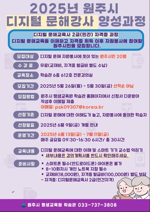 [스포츠서울ㅣ원주=김기원기자]원주시 평생교육원 학습관은 오는 26일(월)부터 30일(금)까지 ‘2025년 원주시 디지털 문해강사 양성과정’ 수강생을 모집한다.