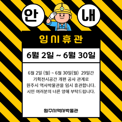 [스포츠서울ㅣ원주=김기원기자]원주시역사박물관은 기획전시공간 및 복합문화공간(라키비움) 조성 공사를 위해 6월 2일부터 30일까지 약 한 달간 임시 휴관에 들어간다.