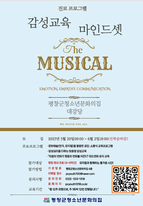 [스포츠서울ㅣ김기원기자]평창군은 뮤지컬 공동 창작을 통해 협동심과 자기 주도적 문제해결력을 향상하는 문화 교육 프로그램 「청소년 감성교육-마인드셋」 과정을 개설하고 참가자를 모집한다.
