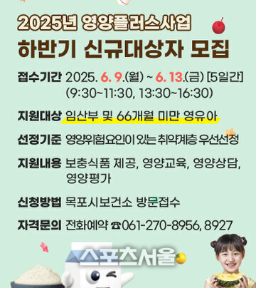 [스포츠서울|조광태기자] 전남 목포시보건소에서는 오는 6월 9일부터 13일까지 5일간 2025년 영양플러스사업 하반기 신규 대상자를 모집한다.