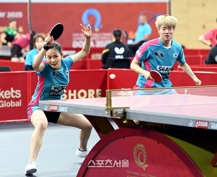 오준성, 김나영이 20일 카타르 도하 카타르대학교 스포츠 컴플렉스에서 열린 2025 국제탁구연맹(ITTF) 세계선수권대회 혼합복식 16강 대만 린윤주-정이칭 조와 경기를 펼치고 있다. 2025. 5. 20. 도하(카타르) | 최승섭기자 thunder@sportsseoul.com