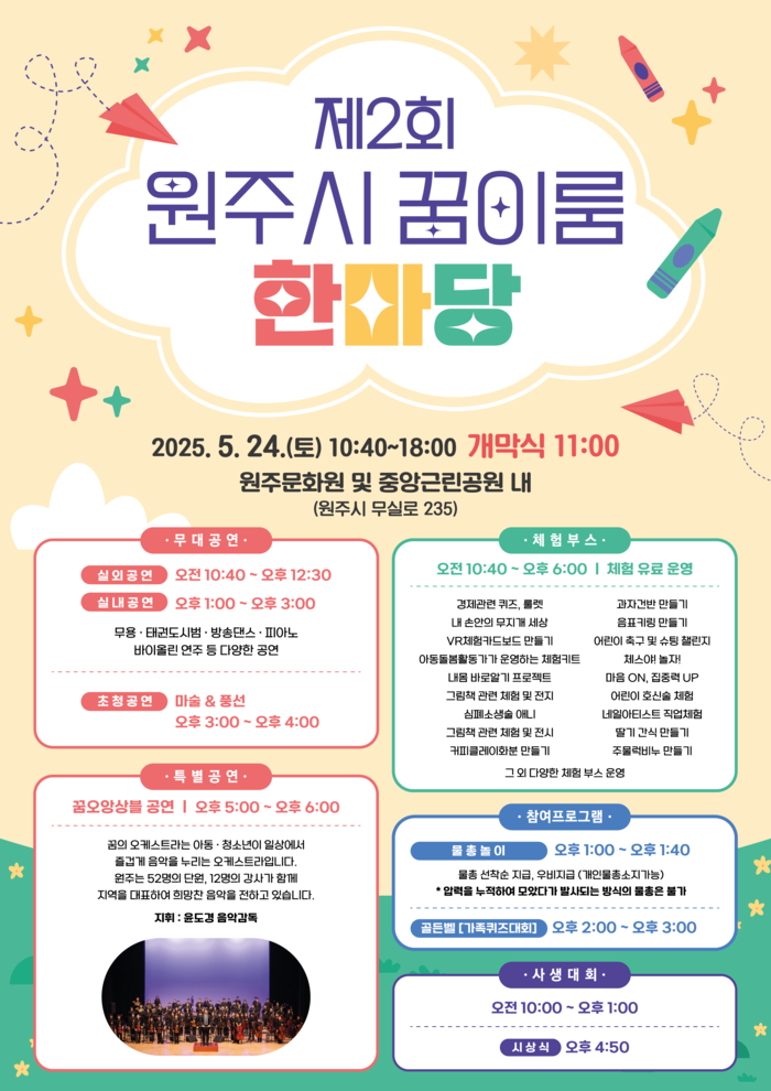 특히 올해 전시 부스는 지역 초등학교와의 협업을 통해 더욱 의미 있게 꾸며지는데, 귀래초·섬강초·치악초 학생들이 참여해 각자의 개성과 상상력이 담긴 그림 작품을 선보이는 특별한 시간이 될 예정이다. 이에 더해 ‘물총놀이’와 ‘가족 골든벨’, 그리고 많은 시민이 기대하고 있는 ‘꿈의 오케스트라’의 야외 공연도 준비돼 있다.
