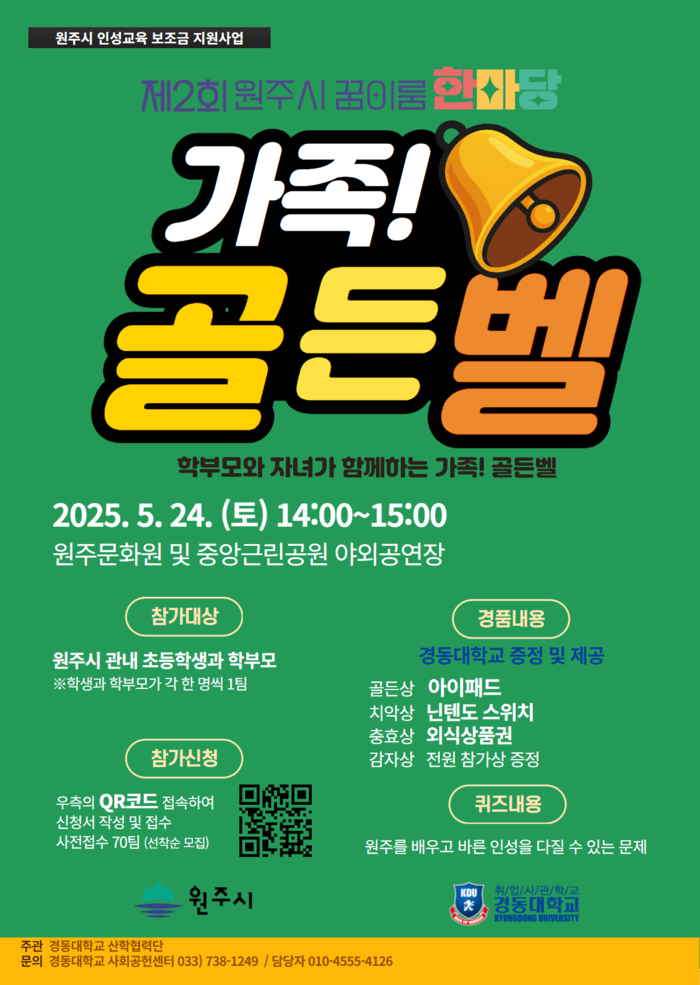 [스포츠서울ㅣ원주=김기원기자]원주시는 2025년 인성교육 지원사업의 일환으로, 오는 24일(토) 오후 2시 ‘제2회 원주시 꿈이룸 한마당’이 열리는 원주문화원에서 ‘가족 골든벨’ 행사를 개최한다.