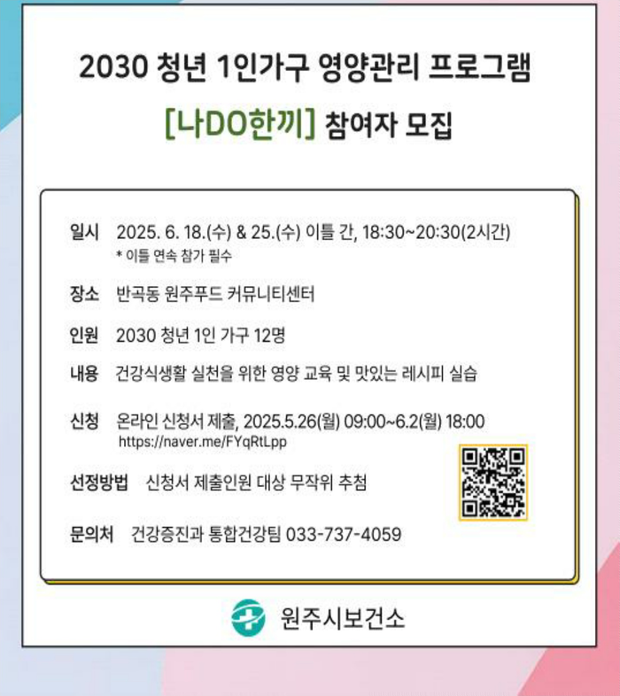 [스포츠서울ㅣ원주=김기원기자]원주시보건소는 2030 청년 1인가구를 위한 영양관리 프로그램인 ‘나DO한끼’를 운영할 계획이다.