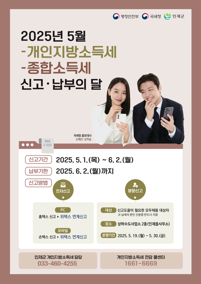 [스포츠서울ㅣ김기원기자]개인지방소득세·종합소득세 신고·납부의 달(매년 5월)을 맞아 인제군은 5월 31일까지 인제군상하수도사업소 2층에서 ‘합동 신고 창구’를 운영한다.