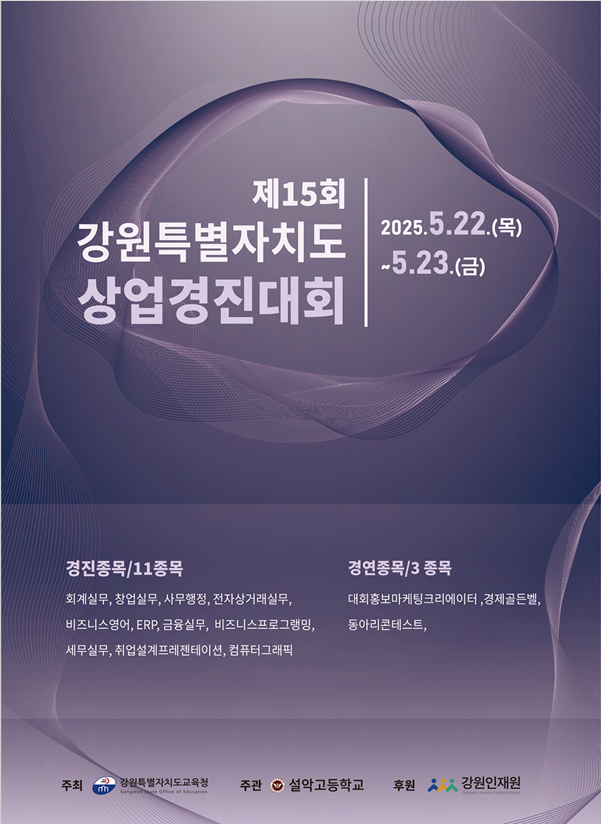 [스포츠서울ㅣ춘천=김기원기자]강원특별자치도교육청(교육감 신경호)은 오는 5월 22일(목)부터 5월 23일(금)까지 속초 설악고등학교에서 ‘2025년 제15회 강원특별자치도 상업경진대회’를 개최한다.