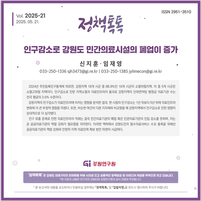 [스포츠서울ㅣ춘천=김기원기자]강원연구원(원장 현진권)은 「인구감소로 강원도 민간의료시설의 폐업이 증가」라는 제목으로 2025년 제21호 정책톡톡을 발간했다.
