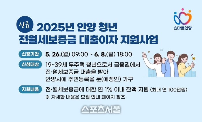 〔스포츠서울│안양=좌승훈기자〕경기 안양시는 청년층의 주거비 부담 완화와 안정적인 정착을 지원하기 위한 ‘청년 전월세보증금 대출이자 지원사업’을 실시한다고 21일 밝혔다.